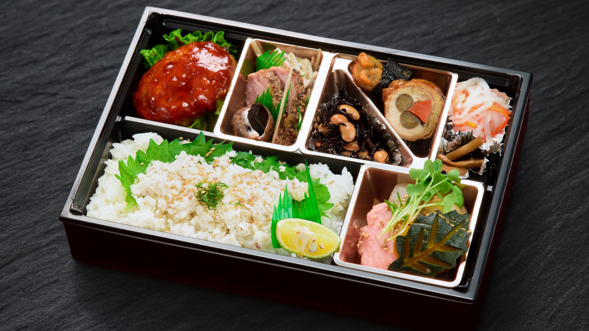 - 鯛の身をほぐして贅沢に盛り込み、食べ応えも十分豪華なお弁当です。