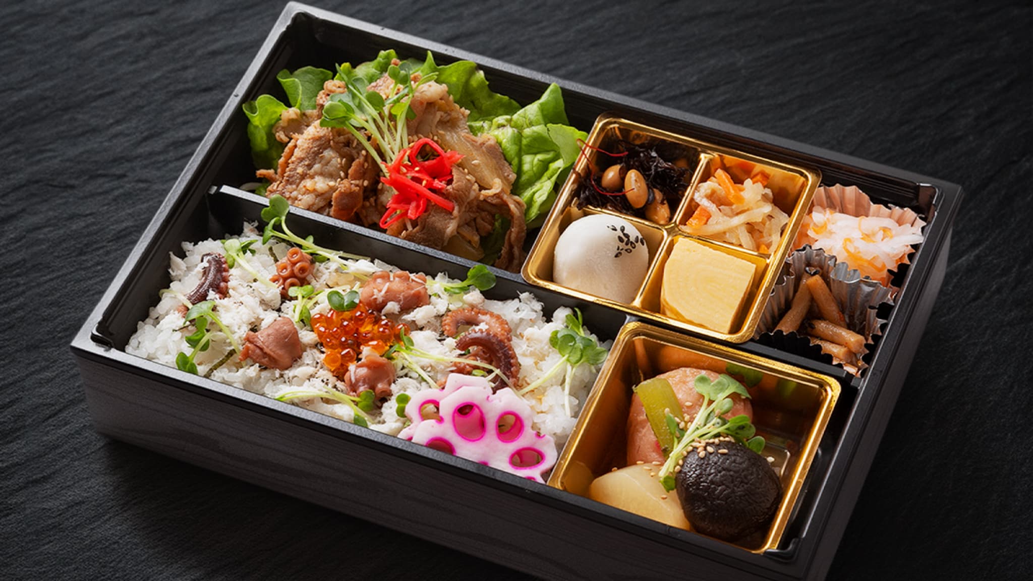 - 彩り鮮やかで、開けた瞬間に心が躍るお祝い事や大切な席にも最適な内容です。