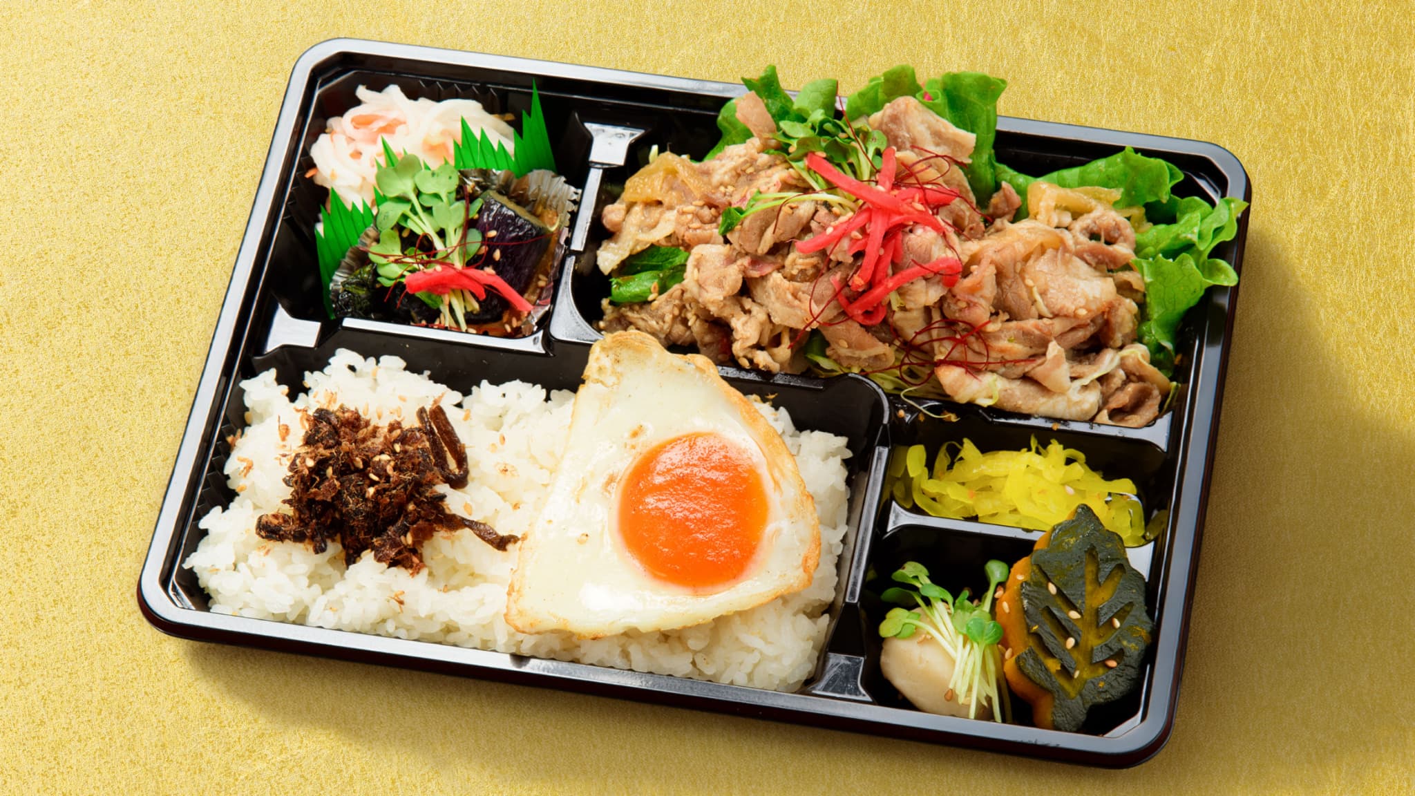 特製甘辛ダレで仕上げた豚生姜焼きは、ご飯が進む定番の味わい。冷めても柔らかく美味しく、副菜もバランスよく盛り込みました。オフィスやロケ、幅広いシーンで活躍できる安定感あるお弁当です。