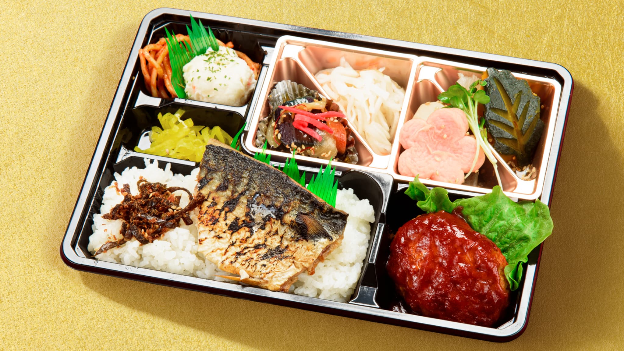 - ふっくらと焼き上げた鯖の塩焼きを中心に、副菜を豊富に詰め合わせた幕の内弁当