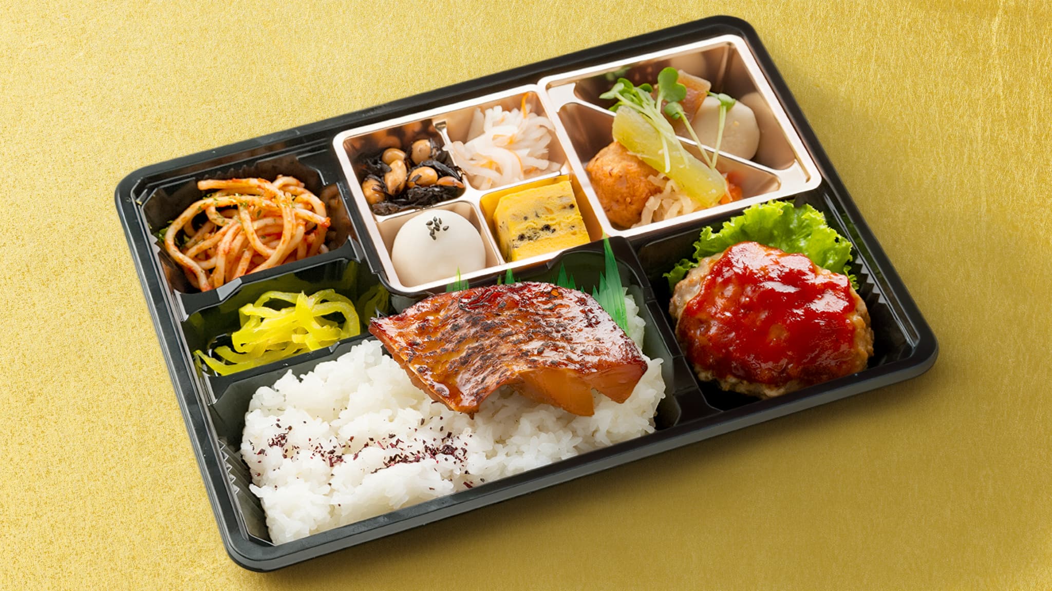 - 赤魚の幽庵焼きを中心に、副菜を豊富に盛り込んだお得感あるお弁当