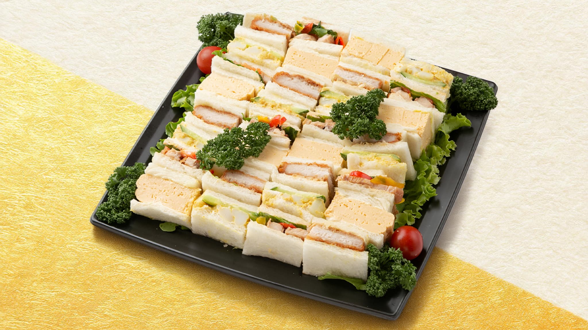 テリヤキ・ポテトサラダ・かつサンド・たまごの4種を詰め込んだ、具だくさんのオリジナルサンドイッチ。 計32個入りで、パーティやイベントにも相性抜群。気軽につまめて、見た目も彩り豊かです。 大人数での会合や社内イベント、差し入れにも使いやすい内容。味のバランスと見栄えに配慮し、年齢層を問わず楽しめる構成です。 取り分けやすいサイズ感で後片付けもスムーズ。