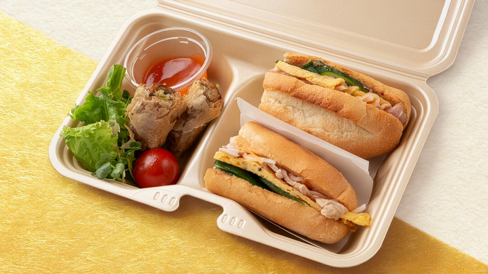 • 豚肉・なます・きゅうり・パクチーをサンドした本格バインミーに、生春巻き2個とサラダを添えたワンボックス。