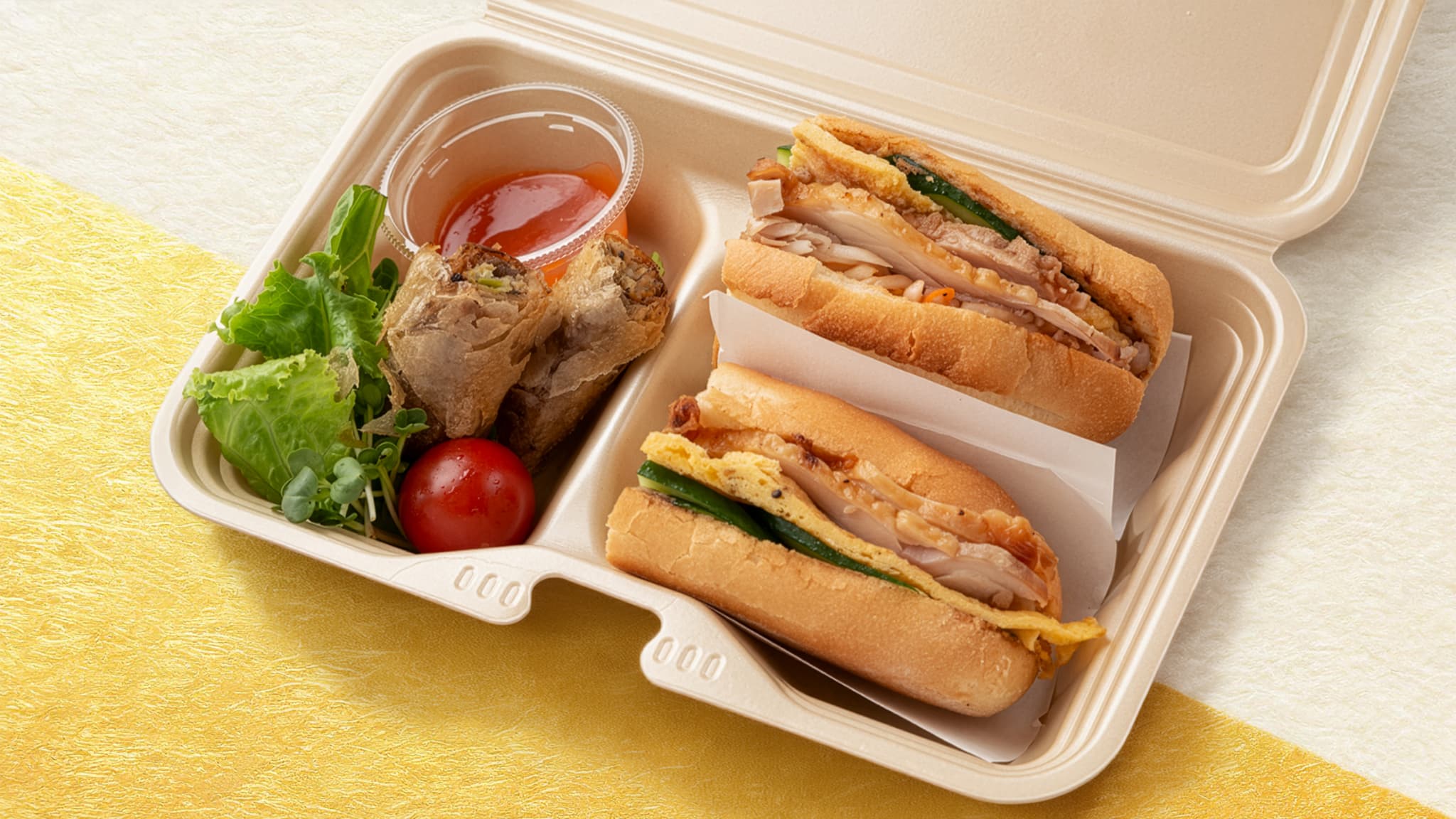 - チキン・なます・きゅうり・パクチーを香ばしいバケットに挟んだバインミーに、生春巻き2個とサラダが付いた満足度たっぷりのイッセイセレクション自慢のワンボックス。